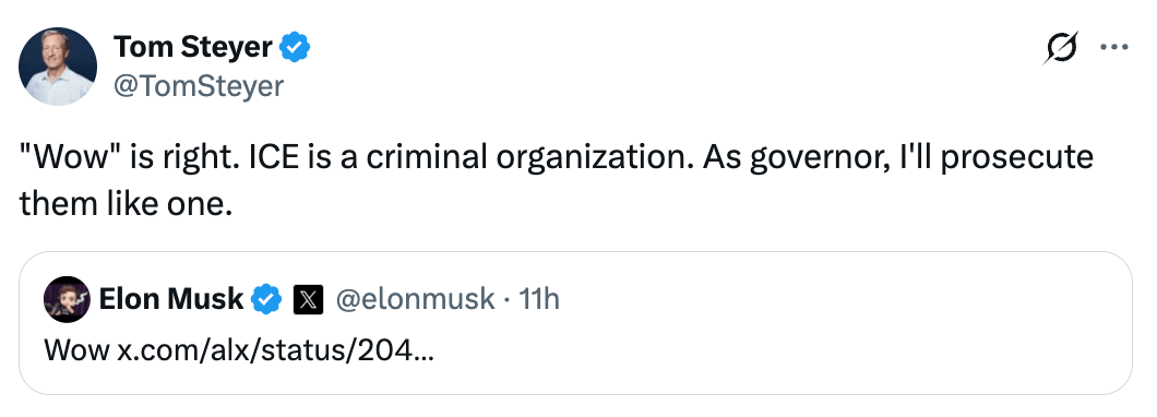 Trump’s attack comes on the heels of right-wing outrage over Steyer’s plans to hold ICE agents legally accountable for criminal conduct — to which Elon Musk replied “Wow” — and PG&E is quietly pouring millions into an anti-Steyer independent expenditure, under the name “Californians for Resilient and Affordable Energy.”